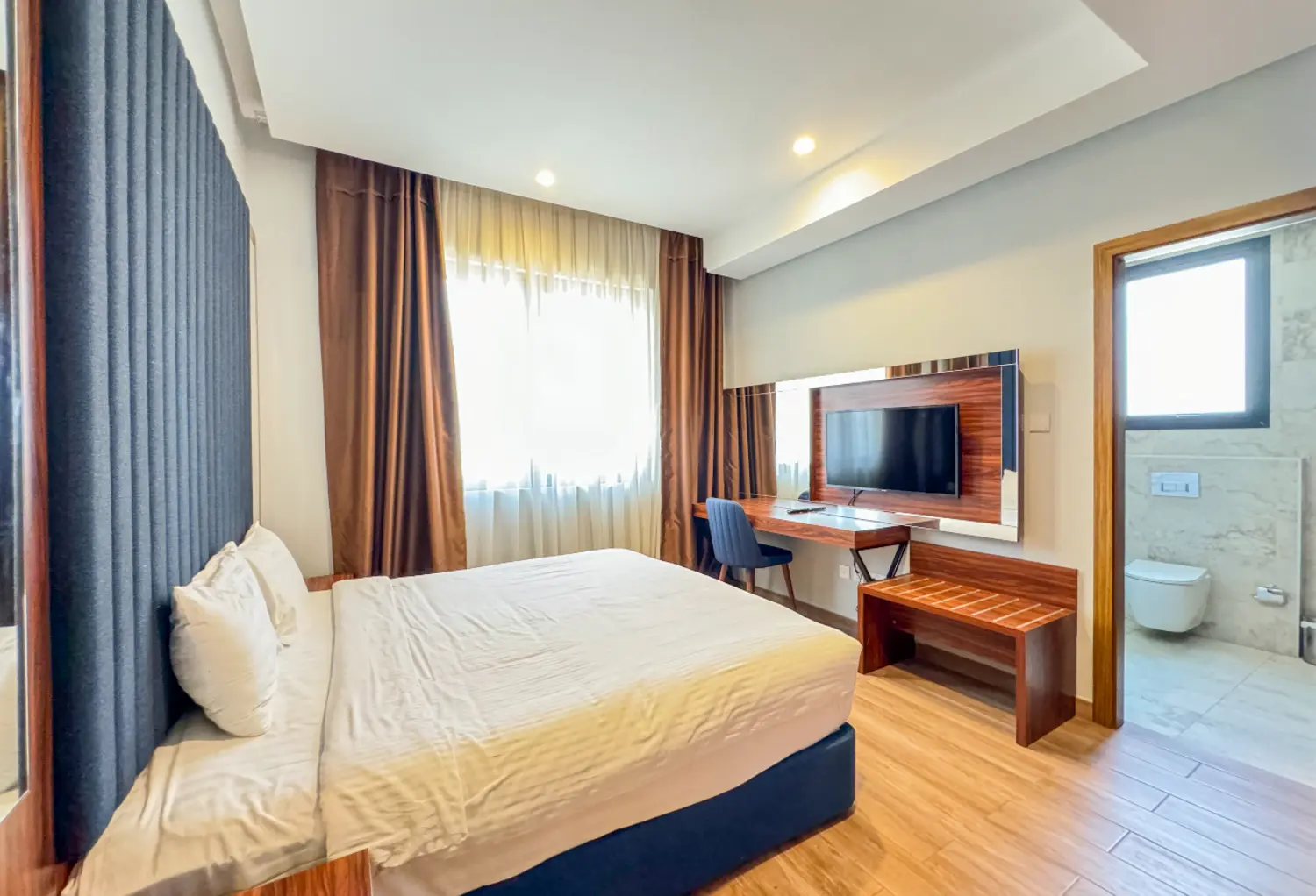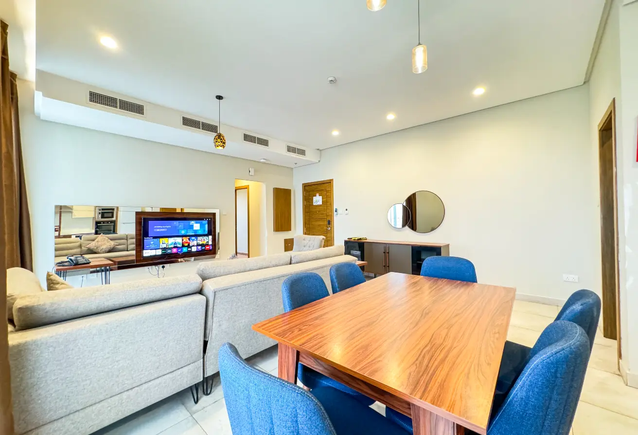 A stunning modern flat in Juffair’s lively center, with huge windows and contemporary furnishings. It is ideal for singles or couples and has one bedroom, a guest toilet, a beautiful living room with a dining area, a modern fully furnished kitchen, and a balcony.