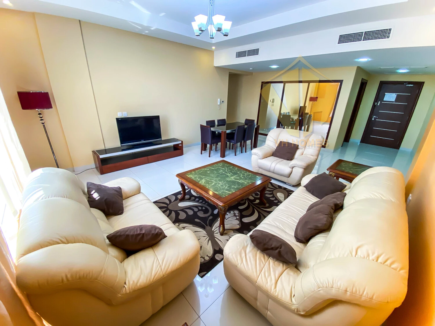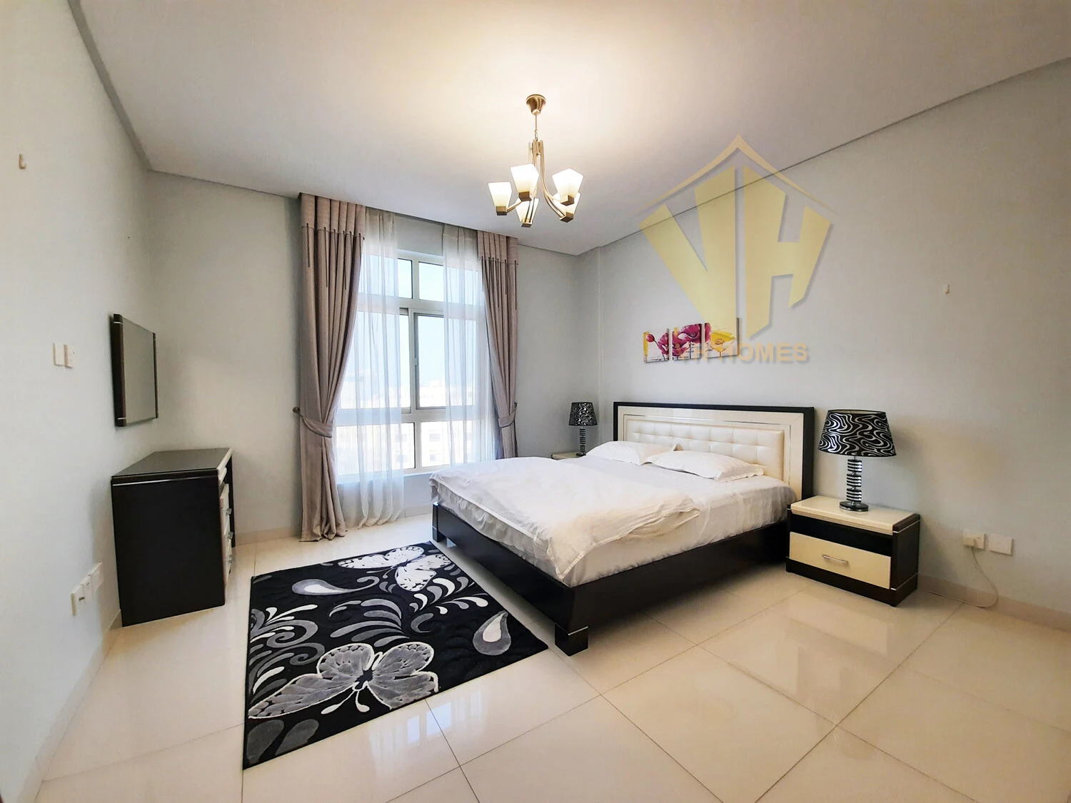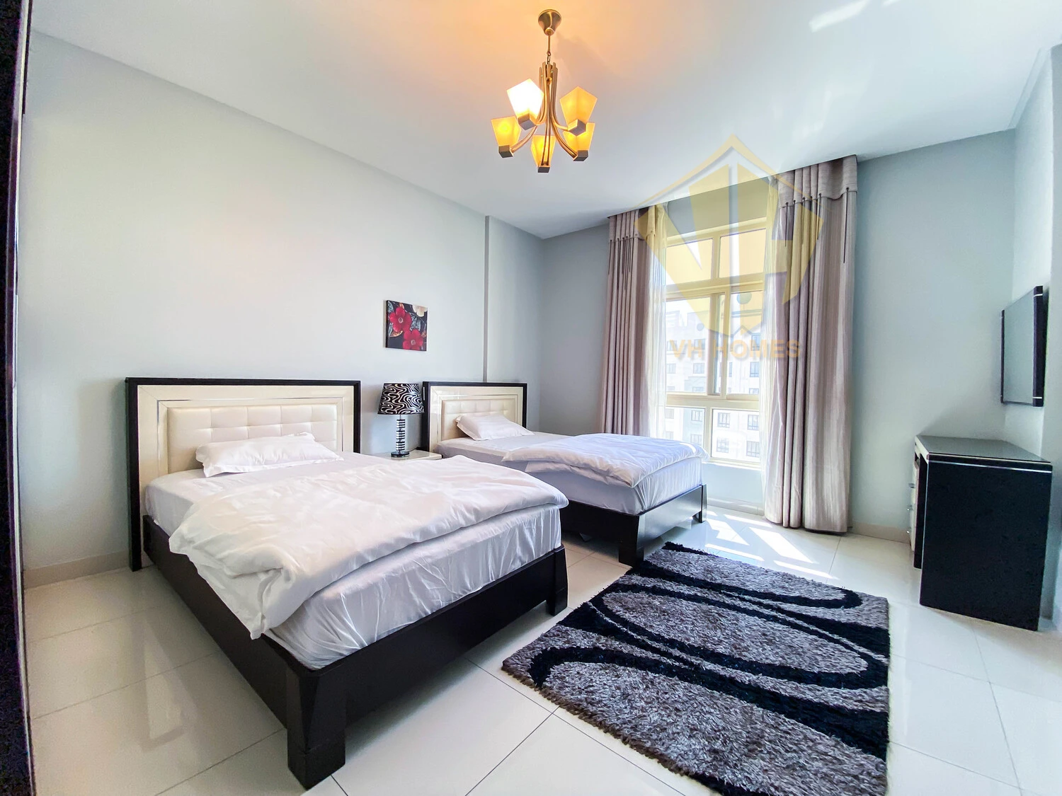 Beautiful and spacious brand new 3 bedrooms with all attached bathrooms, fully furnished modern family apartment in a prestigious tower in Mahooz.–